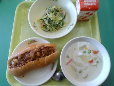チリコンカンはメキシコに由来するアメリカの郷土料理です。今日はひき肉や大豆が入ったそのチリコンカンを、コッペパンにはさんで食べます。