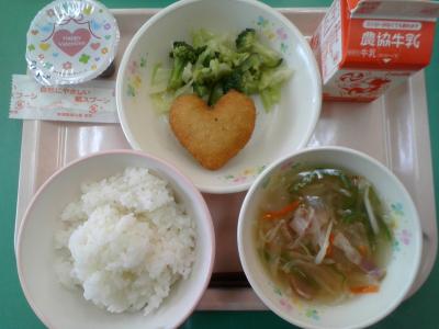今日はバレンタインにちなんだメニューです。ハートのコロッケにハートのチョコプリンがついています。
