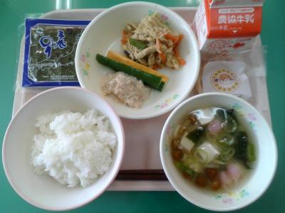 今週は七夕献立からスタート!ハンバーグ、とりにくスタミナ焼き、魚のカレー焼きなどパワーがつきそうなメニューや、ひやむぎ、ブロッコリーとツナのレモンマヨサラダ、きんじそうの酢の物などのさっぱりしたメニューなど、暑さで食欲減退気味の毎日を乗り切る献立を考えてくださっていますね。