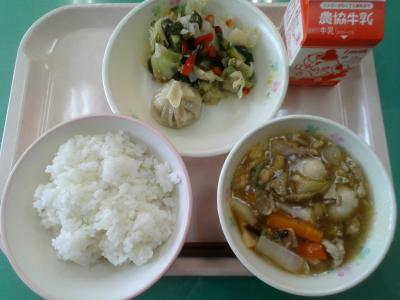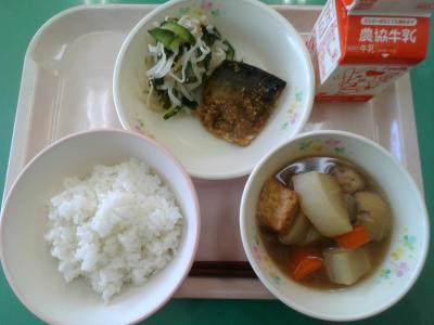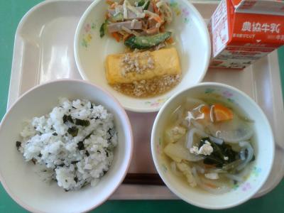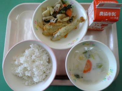 今日の給食は津幡町献立です。津幡町特産のまこもや河北潟の牛乳などが使われています。