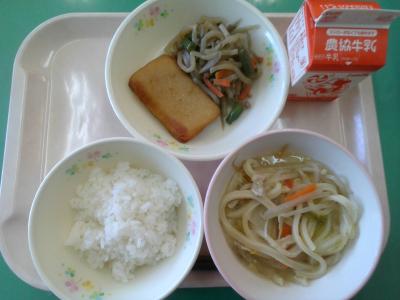 今週は七夕献立からスタート!ハンバーグ、とりにくスタミナ焼き、魚のカレー焼きなどパワーがつきそうなメニューや、ひやむぎ、ブロッコリーとツナのレモンマヨサラダ、きんじそうの酢の物などのさっぱりしたメニューなど、暑さで食欲減退気味の毎日を乗り切る献立を考えてくださっていますね。