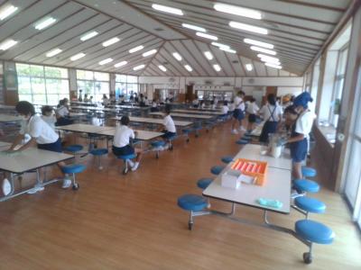 夏の間は各教室で給食を食べていましたが,10月に入り3,6年生はランチルーム給食です。広々空間でゆったりと食べられますね。