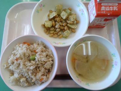 きつねの好物とされる大きな油揚げが入ったうどんは「きつねうどん」です。今日の炊き込みご飯には、細かく切った油揚げが入っているので「こぎつねごはん」といいます。しっかり味がしみていて、美味しくいただけます。