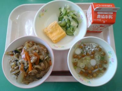 今日は、丼、卵、漬物、みそ汁の和食メニューです。汗をたくさんかいたときは、漬物やみそ汁の塩気がうれしいですね。