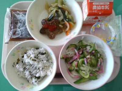 今週は七夕献立からスタート!ハンバーグ、とりにくスタミナ焼き、魚のカレー焼きなどパワーがつきそうなメニューや、ひやむぎ、ブロッコリーとツナのレモンマヨサラダ、きんじそうの酢の物などのさっぱりしたメニューなど、暑さで食欲減退気味の毎日を乗り切る献立を考えてくださっていますね。