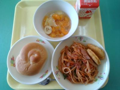 今日はスパゲティナポリタンやチキンナゲットなど洋風のメニューです。フルーツポンチも冷たくてさっぱりといただけますね。