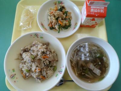 今日の給食は「沖縄献立」です。クファジューシーは豚だしで炊き込んだ沖縄風炊き込みご飯、フーチャンプルーは麩と卵を使った炒めものです。