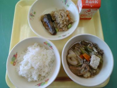 今日の豚汁は、じゃがいも、玉ねぎ、ごぼう、こんにゃく、にんじん、ねぎなど具材がたっぷりはいっています。