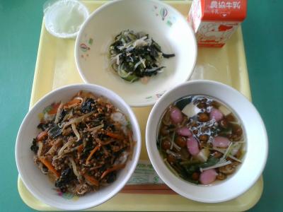 今日の肉みそ丼は、牛肉と豚肉のひき肉に小松菜やにんじん、もやしなどを加え、赤味噌とごま油で味付けをしました。具材がたっぷりのったどんぶりを食べて、暑さに負けないようにしましょう。