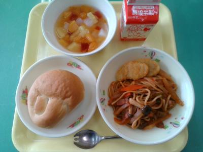 今日はケチャップがたっぷりのスパゲティナポリタンとフルーツポンチでした。米粉ロールにもマッチして美味しかったです。