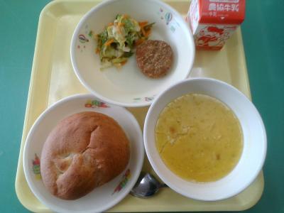 今日のパンは小麦胚芽がはいった胚芽パンズです。メンチカツとキャベツをはさんで食べるとおいしいですね。