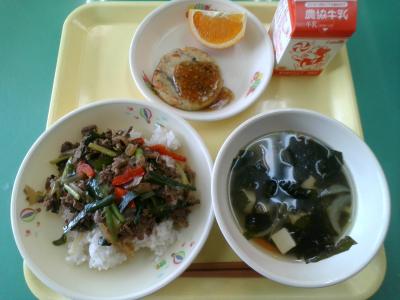 今年度最後の給食は、焼肉丼でした。お肉と野菜がたっぷりのった、ボリュームたっぷりの丼でした。