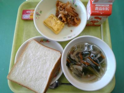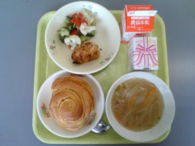 今日は、6年生が小学校で食べる最後の給食です。さつまいもパンとお祝いケーキが6年生のリクエストでした。