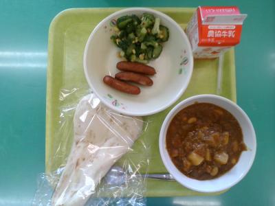 今日はナンにキーマカレーをのせて食べる、ナンカレーです。ナンが6年生のリクエストメニューです。