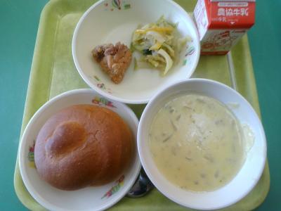 今日から6年生がリクエストしたメニューが給食に出ます。今日はから揚げとコーンポタージュです。