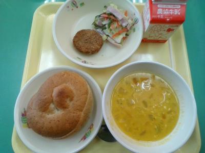 胚芽とは、小麦のやがて芽になる部分のことで、栄養がギュッと詰まっているそうです。今日のパンは小麦胚芽を使った胚芽バンズです。メンチカツをはさんで食べるとより一層美味しいですね。