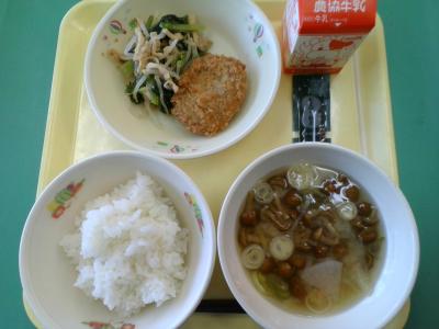 今日の汁物はなめこがたっぷり浮かんだみそ汁でした。なめこのとろみがとてもおいしかったです。