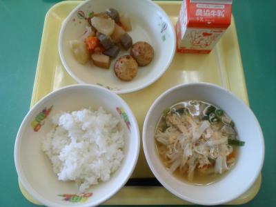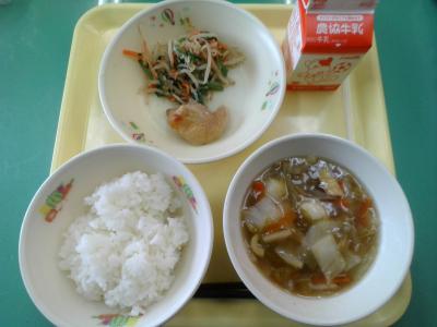 今日の献立表をみると,肉団子とソースには9種類の野菜や果物が使われています。玉ねぎ,にんじん,枝豆,くわい,ねぎ,しょうが,キャベツ,トマト,リンゴ。まさに野菜いろいろ肉団子ですね。