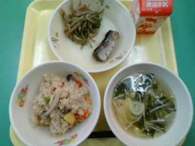 今日の給食は秋の味覚の献立だそうです。秋の香りごはんには栗やしめじが入っています。さんまもおいしそうですね。