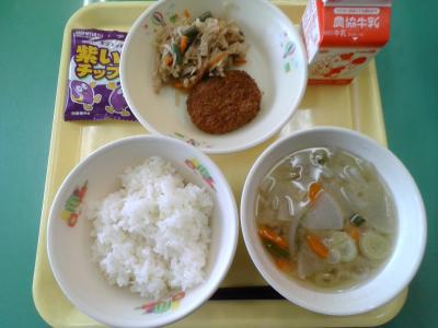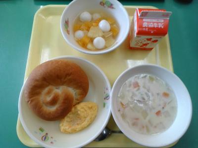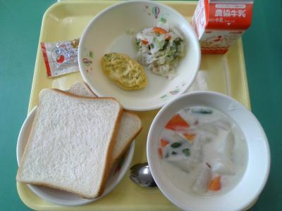 今日の給食は、米粉を使ったミルクロールとコーンチャウダーでした。米粉は小麦粉の代わりにも使えるそうです。(今日のミルクロールには小麦粉も使用しています)