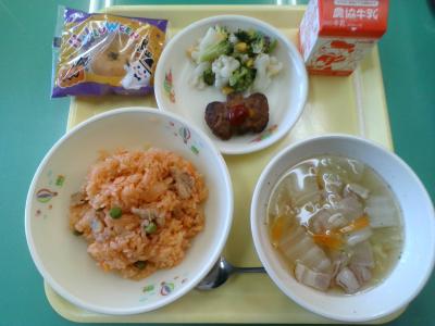今日はハロウィンメニュー。チキンライスの色やハンバーグの形など、見た目にも楽しい給食です。