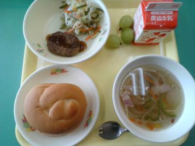 今日から二学期の給食開始です。今日は照り焼きハンバーガーでした。デザートのぶどうも甘くて美味しかったです。