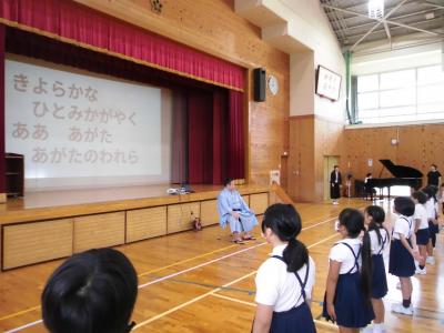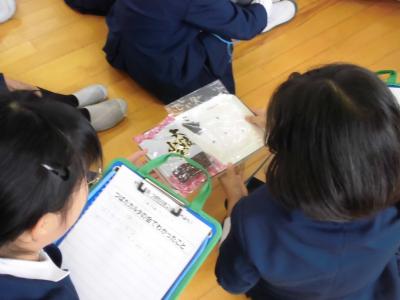 講師に来てくださった皆さんは、英田小にちなんだ読み札を紹介してくださったり、「おまん小豆」と通常の小豆を見比べられるように実物を用意してくださったりと、子供たちが興味を持つことができるように工夫してたくさんのお話をしてくださいました。
