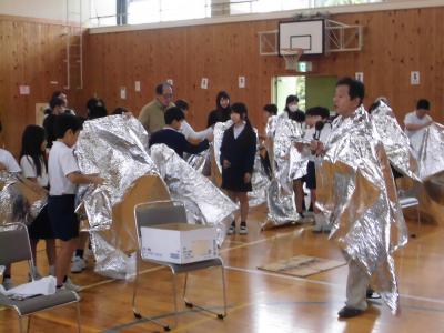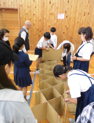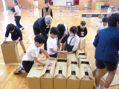この日は、たくさんの地域の方、保護者の方にも参加していただき、緊急時のトイレの作り方や段ボールベッドの組み立て方などを一緒に体験しました。