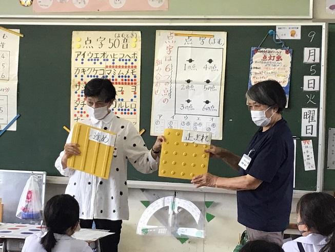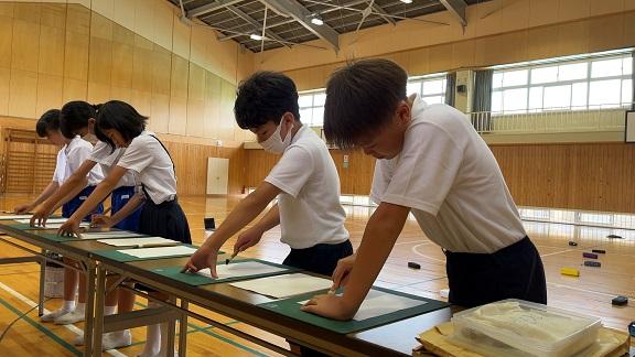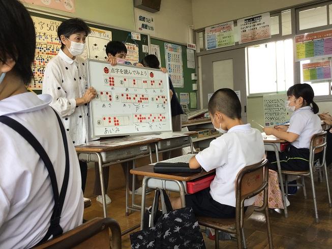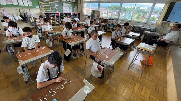 2023年9月8日 10時18分羽咋市の点字ボランティアグループ「点灯虫」の方々から、点字を習いました。1学期の総合的な学習で「点字グループ」だった子たちだけでなく、みんな一生懸命聞いていました。実際に点筆を使って点字を打つときは、どの子も真剣に活動していました。最後に、点灯虫の方々からは、お家にある点字を読んでみてね、と声をかけてもらいました。