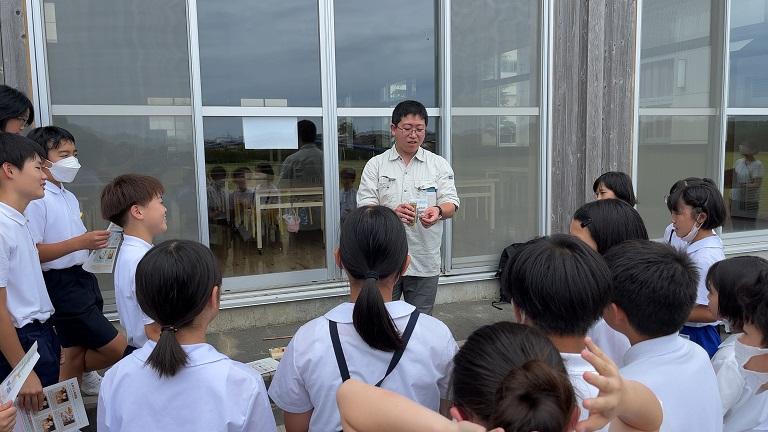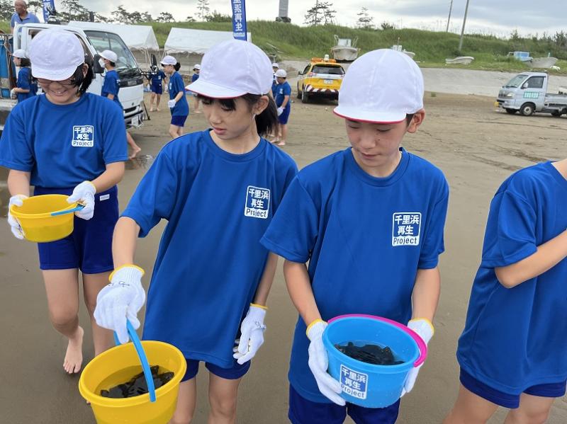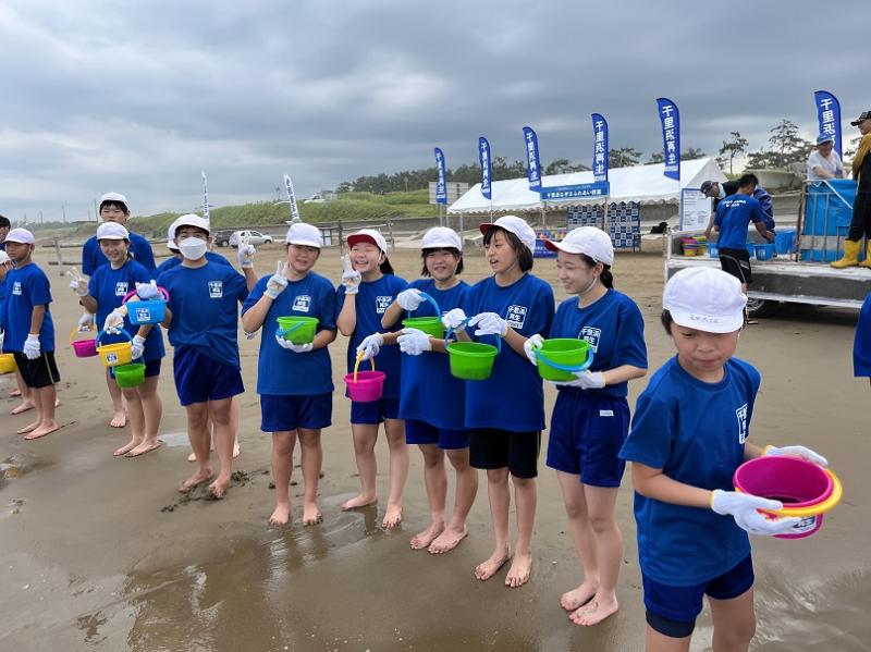 石川県や羽咋市、宝達志水町などでつくる「千里浜再生プロジェクト実行委員会」の方が今浜海岸で「千里浜なぎさふれあい教室を」開き、相見小5.6年生40人が参加しました。そして、ヒラメの稚魚四千匹を放流し、豊かな海を守る気持ちを育みました。はだしで海に入った児童は、体長5センチほどの稚魚を放流しました。その後、砂浜再生を願って海に砂を投げ入れる「一人一砂運動」にも取り組みました。