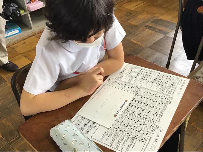 羽咋市の点字ボランティアグループ「点灯虫」の方々から、点字を習いました。1学期の総合的な学習で「点字グループ」だった子たちだけでなく、みんな一生懸命聞いていました。実際に点筆を使って点字を打つときは、どの子も真剣に活動していました。最後に、点灯虫の方々からは、お家にある点字を読んでみてね、と声をかけてもらいました。