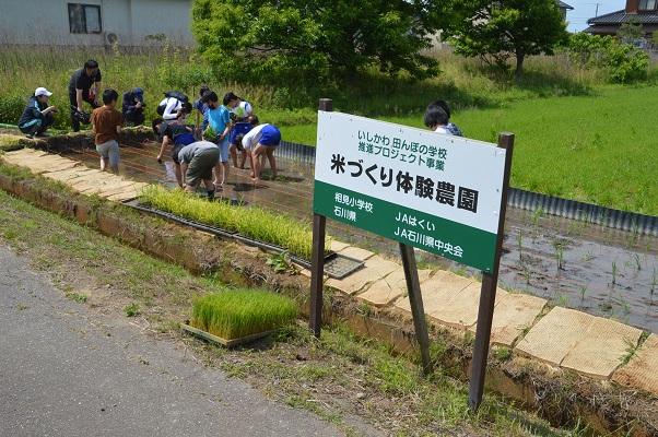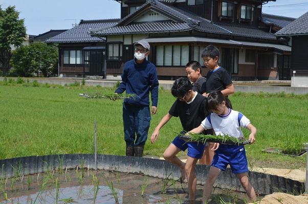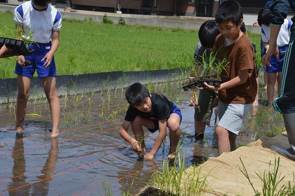 学校近くの米づくり体験農園で、古代米「赤米」やコシヒカリの田植えを行いました。地域の先生の山田さんに教