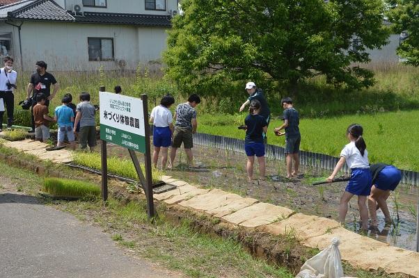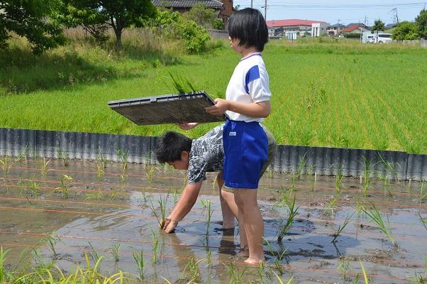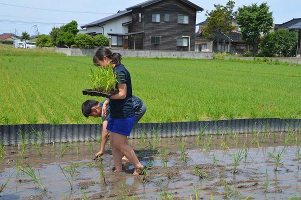 えていただきながら、子ども達は、約300㎡の水田にはだしで入り、丁寧に苗を植えました。10月上旬に収穫の予定