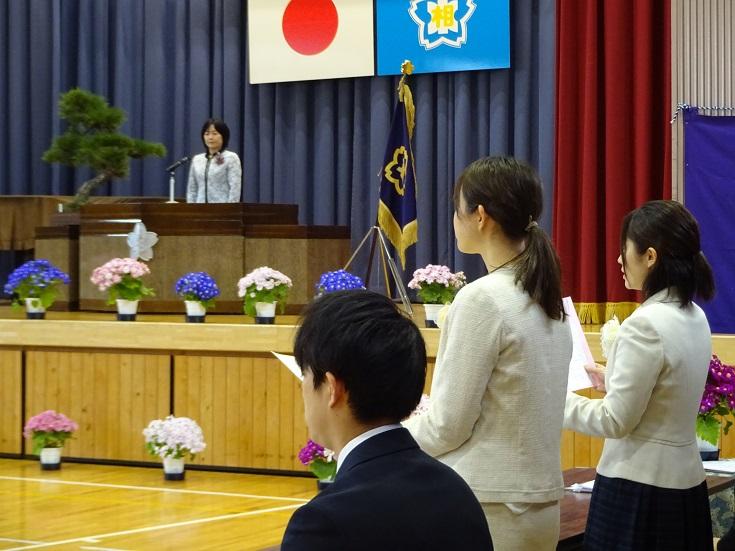 入学式では、担任から1年生一人一人に呼名があり、全員が元気に「はい」と返事ができました。在校生代表とし