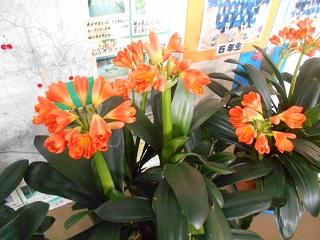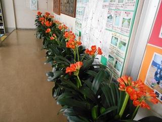 今、君子蘭が満開です。児童玄関を入ると、鮮やかな朱色で私達を迎えてくれます。冬を乗り越え、今年も見事に咲きました。