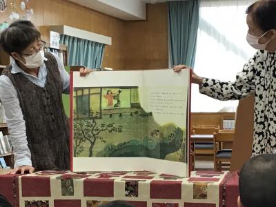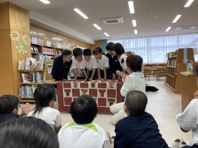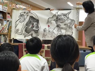 10月8日(火)3時間目におひさまクラブの方々によるお話会がありました。巻物絵本、大型絵本、紙芝居など、工夫を凝らした演出に、聞いている4年生も、お話の世界に引き込まれていました。最後には、順番に誕生日を祝い願いを込めてローソクを吹き消すコーナーがあり、笑顔で祈ったり祝ったりした子供たちでした。来週は5年生、再来週は6年生がお話会を体験します。