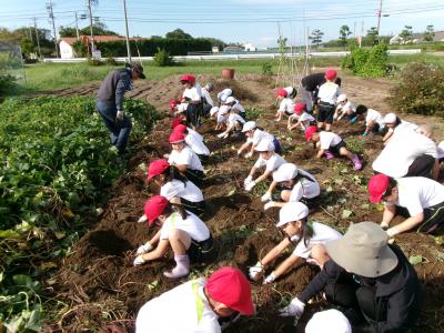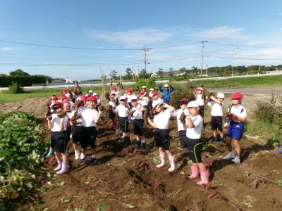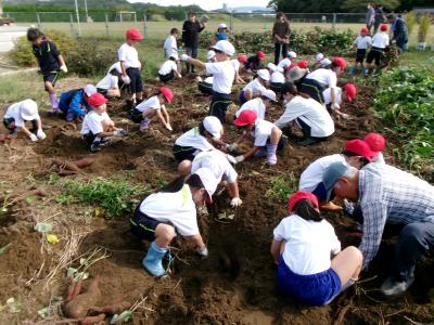 10月10日(木)1時間目、1・2年生が芋掘りを体験しました。学校ボランティアの山田礼二さんが先生になって芋掘りのこつを教えてくださいました。山田さんには芋苗を植えるときも教えていただき、その後のお世話もしてくださいました。子供たちは、おいもを傷つけないように周りの土を掘り進め、大きな大きなおいもを掘り出すことができました。次から次に現れる大きなおいもに大きな歓声を上げながら、1時間たっぷりと体験できました。今日は、おうちに2つ持って帰ります。「天ぷらにしたいな」「スイートポテトもおいしいね」など、ウキウキの子供たちです。山田礼二さんを始めお手伝いをしてくださった皆さん、本当にありがとうございました。