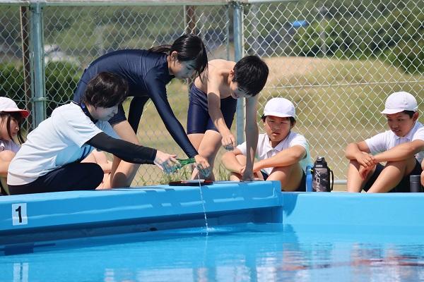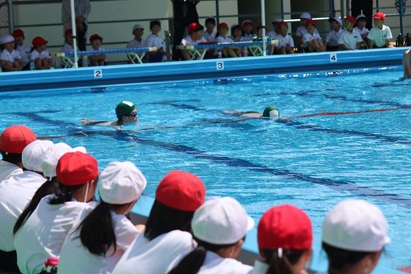 6月12日(水)に今年度のプール開きが行われました。体育館でプールについての話があった後、いよいよプールへ。改修後のプールを見るのは初めての子供たちは、きれいなプールに目を輝かせていました。安全祈願のお清めの後、6年生が模範泳法の披露を行いました。クロール、平泳ぎ、背泳ぎ、バタフライといった様々な泳ぎを目にした子供たちからは「お~」と、どよめきの声が上がっていました。