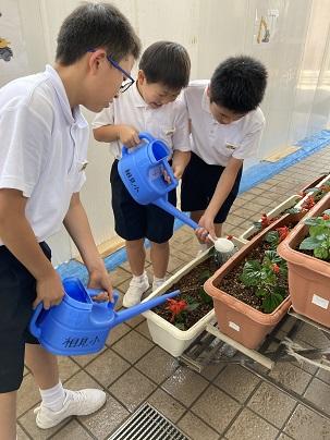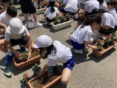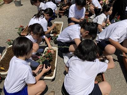 6月21日(金)3年生と4年生が、サルビアの苗をプランターに移植しました。本校用務員の元女さんが、土やプランターの準備と植え方の指導をしてくれました。3・4年生は、苗を優しく扱いながら協力して植えてていました。その後、児童玄関の棚へと運んで、たくさん花を咲かせることを楽しみにたっぷりと水をやりました。工事のため花壇もなく、さみしい玄関になりそうでしたが、3・4年生が植えたサルビアが赤く華やかに玄関を彩ってくれています。