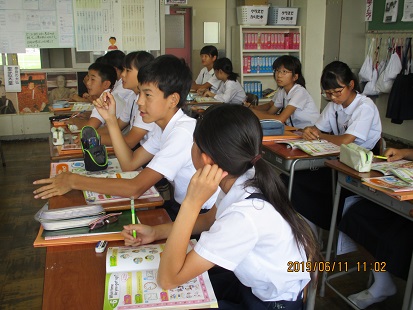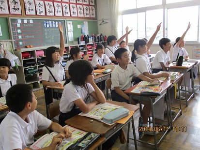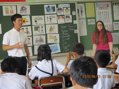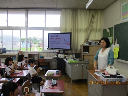亀井先生とドロシー先生と、6年生が英語学習をしています。