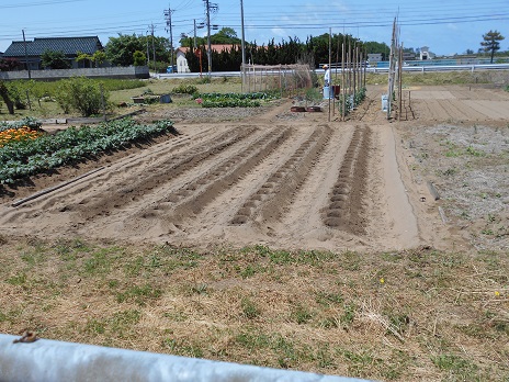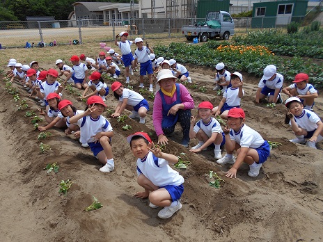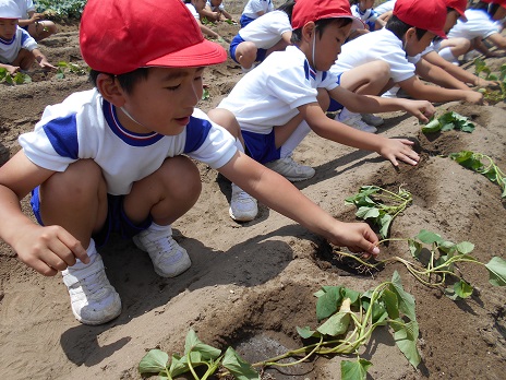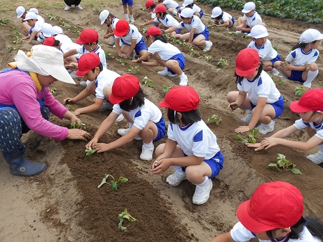 昨日、1年生と2年生が、さつまいもの苗植えをしました。