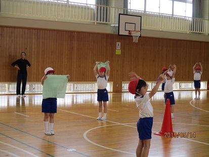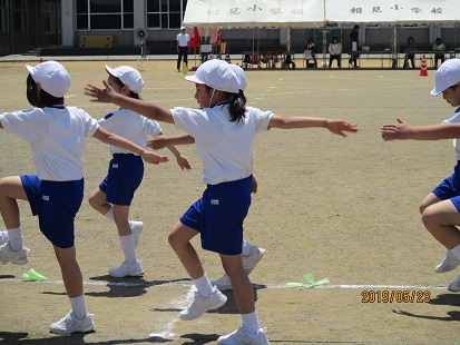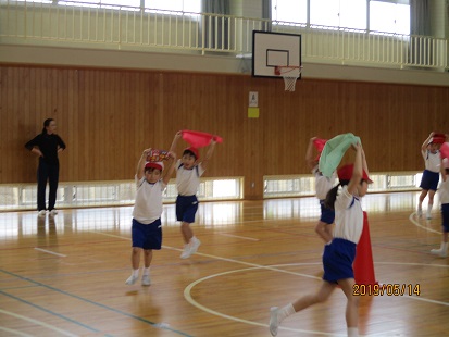 体育館をのぞいていると、2年生が運動会のダンスの練習中。