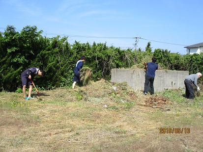 男の先生方には、運動場の隅に沢山たまった草を、上げてもらいました。