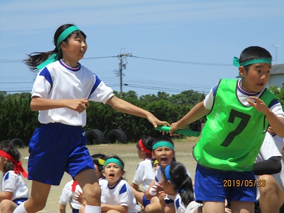 1年生から6年生のアンカーまで、バトンをつないで走ります。
