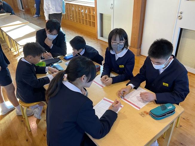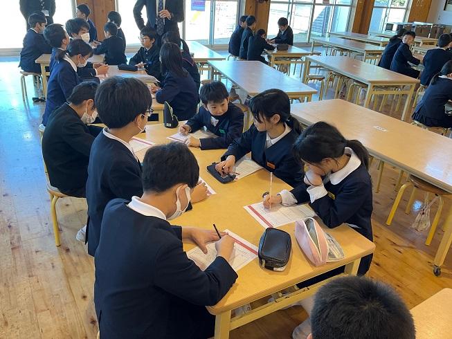 押水地区3校の5・6年生約80人が集まり、国語、算数、社会など、複数の教科の力が試される課題に挑戦しました。ワークショップ形式の課題を通じて、考えを出し合い、学びを深めました。