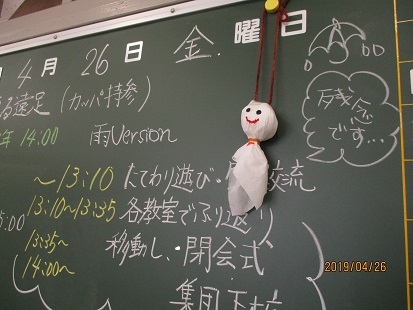 ↓職員室の黒板です。てるてる坊主の願いかなわず・・・・