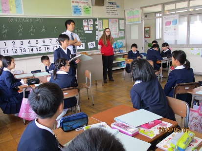 その5年生教室では、英語の授業。亀井順平先生&ドロシー先生と。