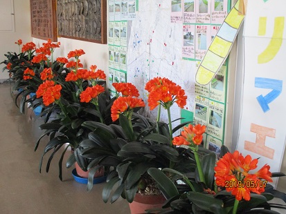 現在、素晴らしいのが、児童玄関前の廊下に並ぶ10鉢の君子蘭です。