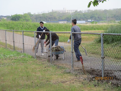 学校周りの溝の枯葉や泥をさらえ、一輪車で何回も運び、