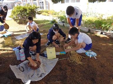 約1か月半、教室の風通しのよいところに干してあったコシヒカリの脱穀作業を、手作業でしました。